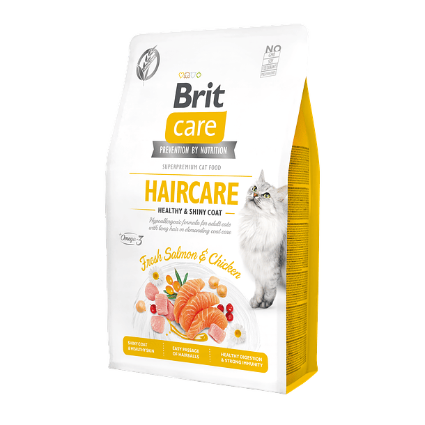 Brit Care Cat Haircare Healthy and Shiny Coat es un alimento hipoalergénico para gatos adultos con altas exigencias de cuidado de piel y pelaje. Formulado con salmón fresco (26%) y fuentes naturales de omega-3 y omega-6, ayuda a mantener un pelaje saludable. Su contenido de fibra facilita el paso de las bolas de pelo y contribuye al control de peso al crear una sensación de saciedad. Libre de cereales, colorantes, conservantes, OMG y soja.