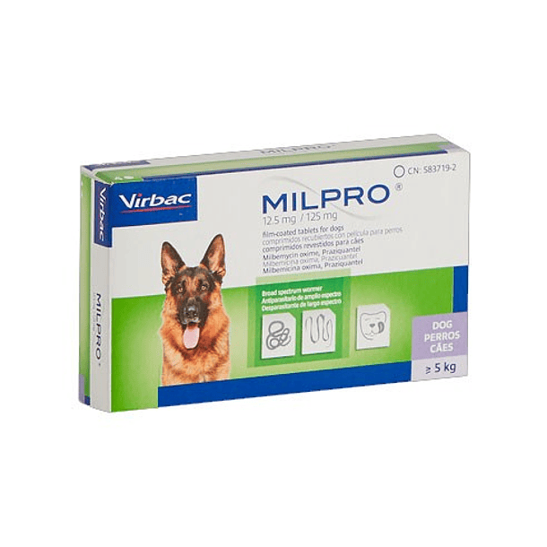 Virbac Milpro Perro Adulto 5 kg es un antiparasitario eficaz diseñado para perros adultos de peso medio (de 5 a 10 kg). Este medicamento combate infestaciones tanto de nematodos (gusanos redondos) como cestodos (tenias) gracias a su combinación de milbemicina oxima y praziquantel.